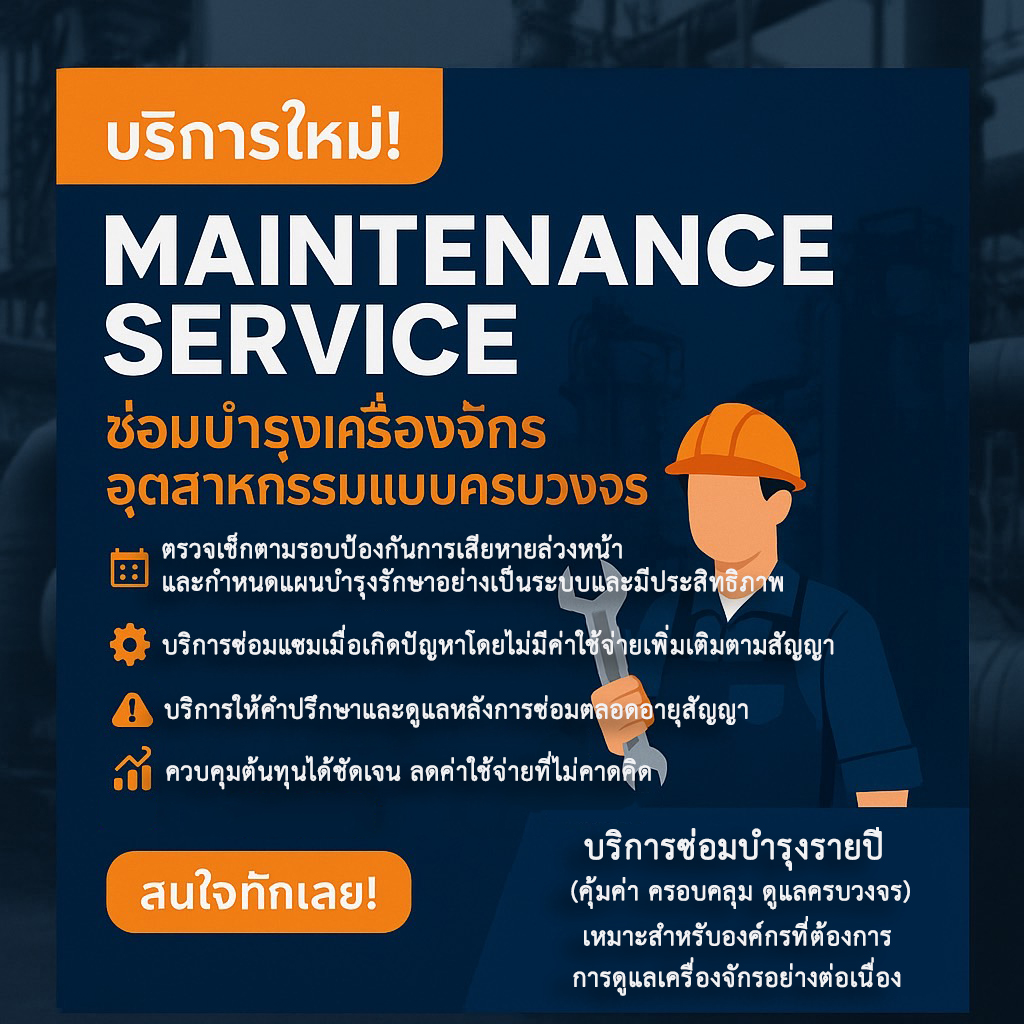 เราให้บริการซ่อมบำรุง ดูแล ตรวจสอบ แก้ไข หรือปรับปรุงเครื่องจักร อุปกรณ์ ระบบงาน หรือโครงสร้างต่างๆ ให้อยู่ในสภาพพร้อมใช้งานอย่างมีประสิทธิภาพและปลอดภัย